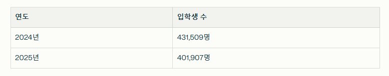 아래 표를 보면 최근 2년간 입학생 수가 얼마나 빨리 감소하고 있는지 한눈에 알 수 있습니다.